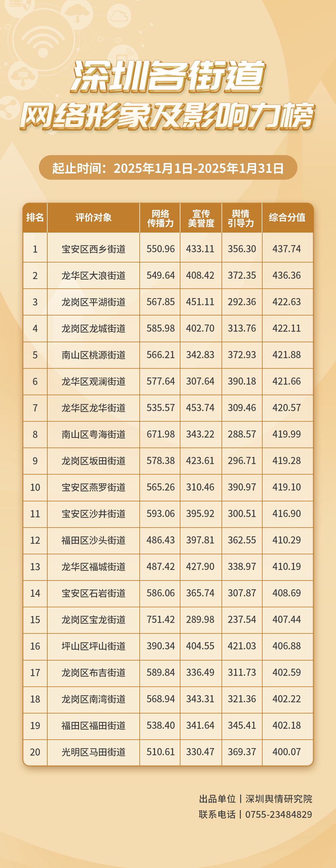 2025年1月,共有20個街道登上《深圳各街道網(wǎng)絡(luò)形象及影響力榜》,分別是:寶安區(qū)西鄉(xiāng)街道、龍華區(qū)大浪街道、龍崗區(qū)平湖街道、龍崗區(qū)龍城街道、南山區(qū)桃源街道、龍華區(qū)觀瀾街道、龍華區(qū)龍華街道、南山區(qū)粵海街道、龍崗區(qū)坂田街道、寶安區(qū)燕羅街道、寶安區(qū)沙井街道、福田區(qū)沙頭街道、龍華區(qū)福城街道、寶安區(qū)石巖街道、龍崗區(qū)寶龍街道、坪山區(qū)坪山街道、龍崗區(qū)布吉街道、龍崗區(qū)南灣街道、福田區(qū)福田街道、光明區(qū)馬田街道。