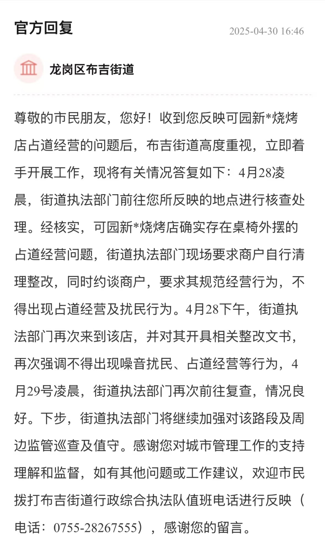 針對(duì)燒烤店占道經(jīng)營(yíng)與凌晨噪音擾民問(wèn)題,街道辦行動(dòng)迅速,回應(yīng)中處置流程清晰。在現(xiàn)場(chǎng)核查確認(rèn)違規(guī)事實(shí)后,街道辦開(kāi)具整改文書,開(kāi)展復(fù)查、加強(qiáng)周邊監(jiān)管,解決商業(yè)經(jīng)營(yíng)店鋪擾民問(wèn)題,以規(guī)范行動(dòng)守護(hù)居民“寧?kù)o權(quán)”,展現(xiàn)了基層執(zhí)法的高效務(wù)實(shí),切實(shí)提升了群眾生活幸福感。