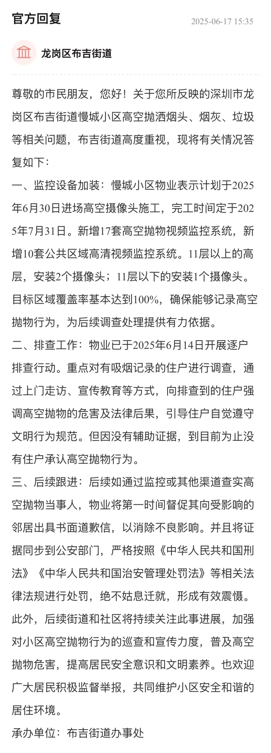 高空拋物嚴重威脅居民人身與財產(chǎn)安全,需嚴肅對待。街道辦接到相關反映后,積極推動物業(yè)規(guī)劃加裝視頻監(jiān)控系統(tǒng),明確了施工和完工時間,同時安排物業(yè)開展逐戶排查,重點調(diào)查有吸煙記錄住戶,體現(xiàn)出對問題的重視和解決問題的行動力。在后續(xù)保障方面,明確查實拋物當事人后將督促其道歉并交由公安部門依規(guī)處罰,街道和社區(qū)也將持續(xù)關注、加強巡查與宣傳,為維護小區(qū)安全提供了有力支持。