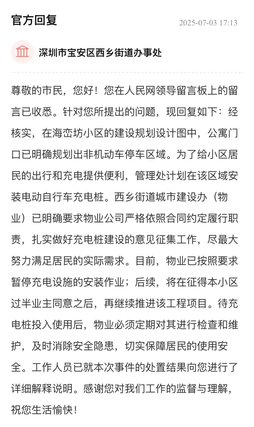 有市民反映寶安區(qū)西鄉(xiāng)街道一小區(qū)物業(yè)強行建設充電樁