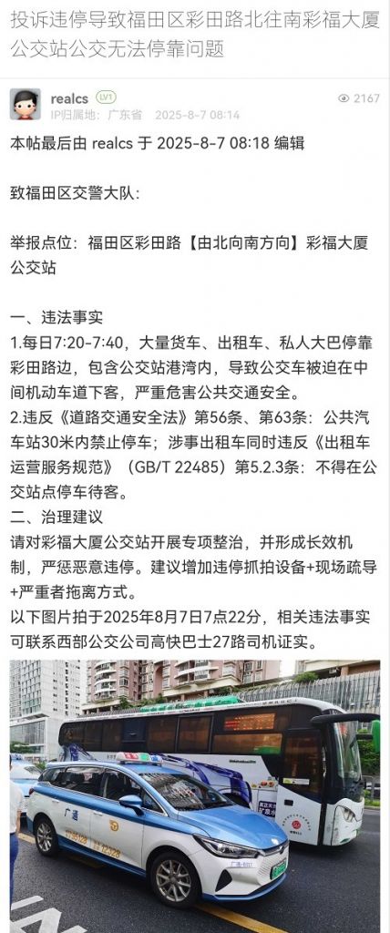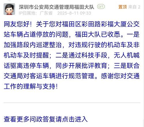 16. 帖文《投訴違停導(dǎo)致福田區(qū)彩田路北往南彩福大廈公交站公交無(wú)法停靠問題》