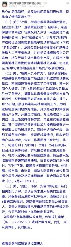 (二)關(guān)于“相關(guān)人員不作為”:自收到居民反對(duì)京基御景華城商業(yè)廣場(chǎng)改建手機(jī)維修市場(chǎng)的意見后,南園街道首先是成立了工作專班,第一時(shí)間介入處置。7月14日起多次約見京基公司和龍勝公司負(fù)責(zé)人,提醒其認(rèn)真考量商業(yè)規(guī)劃方案的可行性,積極探索更為妥善的商業(yè)方案,并于7月16日起開展現(xiàn)場(chǎng)走訪與檔案調(diào)閱工作,為后續(xù)解答居民問題做好準(zhǔn)備。其次是定向收集居民和商戶訴求,開展走訪座談。專班通過(guò)線下見面訪談、線上添加微信等方式,與業(yè)主代表建立聯(lián)系,其中街道掛點(diǎn)領(lǐng)導(dǎo)主動(dòng)加入樓棟微信群進(jìn)一步聽取大家的訴求意見。同時(shí)走訪商戶代表,詳細(xì)了解各商戶租約、經(jīng)營(yíng)現(xiàn)狀等情況,耐心聽取商戶核心訴求,告知工作進(jìn)展及下步計(jì)劃。此外,街道分別于7月18日、23日、26日及8月4日召開居民協(xié)調(diào)會(huì)、群眾接訪會(huì)和業(yè)主見面會(huì)等,針對(duì)大家關(guān)心的問題答疑解惑。然后是積極收集材料并研究政策法規(guī),協(xié)調(diào)相關(guān)部門深入探討。7月中下旬,街道多次組織區(qū)商務(wù)局、住建局、規(guī)自局、市監(jiān)局、消防大隊(duì)等相關(guān)單位共同研究居民訴求及相關(guān)問題清單,聯(lián)合回應(yīng)居民訴求(已于7月26日召開)。