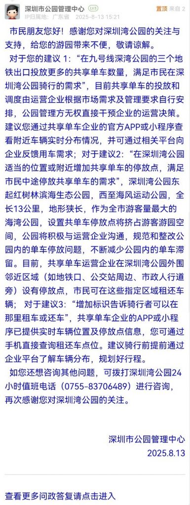對(duì)于您的建議 1:“在九號(hào)線深灣公園的三個(gè)地鐵出口投放更多的共享單車數(shù)量,滿足市民在深圳灣公園騎行的需求”,目前共享單車的投放和調(diào)度由運(yùn)營(yíng)企業(yè)根據(jù)市場(chǎng)需求及管理要求自行安排,公園管理方無(wú)權(quán)直接干預(yù)企業(yè)的運(yùn)營(yíng)決策。建議您通過(guò)共享單車企業(yè)的官方APP或小程序查看附近車輛實(shí)時(shí)分布情況,并可通過(guò)相關(guān)平臺(tái)向企業(yè)反饋用車需求;對(duì)于建議2:“在深圳灣公園適當(dāng)?shù)奈恢没蚋浇黾庸蚕韱诬嚨耐7劈c(diǎn),滿足市民中途停放共享單車的需求”,深圳灣公園東起紅樹林濱海生態(tài)公園,西至海風(fēng)運(yùn)動(dòng)公園,全長(zhǎng)13公里,地形狹長(zhǎng),作為全市游客量最大的海灣公園,設(shè)置共單車停放點(diǎn)將擠占游客游園空間,公園將積極與運(yùn)營(yíng)企業(yè)溝通,規(guī)范和整改公園內(nèi)的單車停放問題,不斷減少公園內(nèi)的單車滯留。目前,共享單車運(yùn)營(yíng)企業(yè)在深圳灣公園外圍鄰近區(qū)域(如地鐵口、公交站周邊、市政人行道旁)設(shè)有停放點(diǎn),市民可在這些指定區(qū)域租還車輛; 對(duì)于建議3:“增加標(biāo)識(shí)告訴騎行者可以在那里租車或還車”,共享單車企業(yè)的APP或小程序已提供實(shí)時(shí)車輛位置及停放點(diǎn)信息,您可通過(guò)手機(jī)直接查詢租還車點(diǎn)位。建議騎行前提前通過(guò)企業(yè)平臺(tái)了解車輛分布,規(guī)劃好行程。