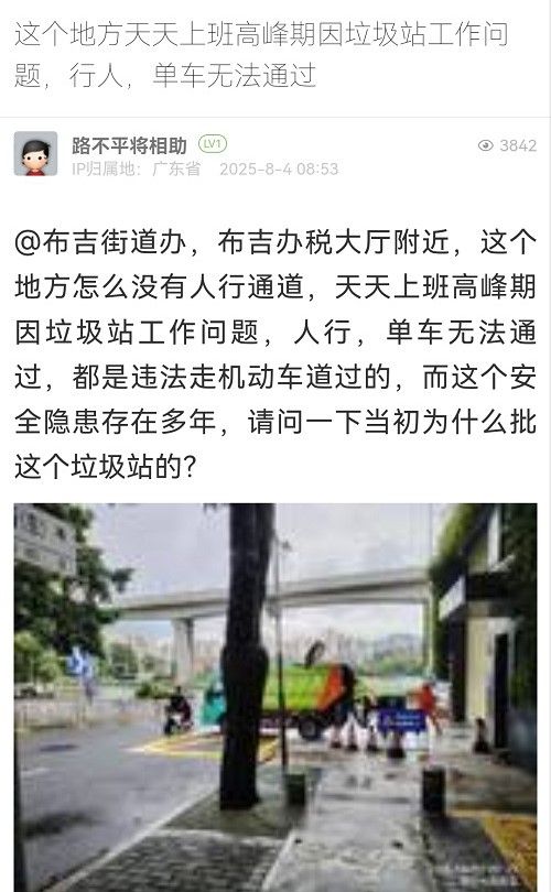 1. 帖文《這個(gè)地方天天上班高峰期因垃圾站工作問題,行人,單車無(wú)法通過(guò)》