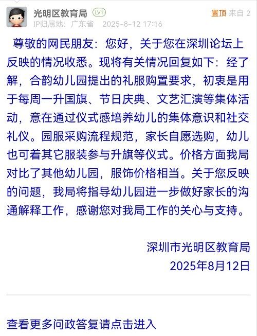尊敬的網(wǎng)民朋友:您好,關(guān)于您在深圳論壇上反映的情況收悉。現(xiàn)將有關(guān)情況回復(fù)如下:經(jīng)了解,合韻幼兒園提出的禮服購(gòu)置要求,初衷是用于每周一升國(guó)旗、節(jié)日慶典、文藝匯演等集體活動(dòng),意在通過(guò)儀式感培養(yǎng)幼兒的集體意識(shí)和社交禮儀。園服采購(gòu)流程規(guī)范,家長(zhǎng)自愿選購(gòu),幼兒也可著其它服裝參與升旗等儀式。價(jià)格方面我局對(duì)比了其他幼兒園,服飾價(jià)格相當(dāng)。關(guān)于您反映的問題,我局將指導(dǎo)幼兒園進(jìn)一步做好家長(zhǎng)的溝通解釋工作,感謝您對(duì)我局工作的關(guān)心與支持。