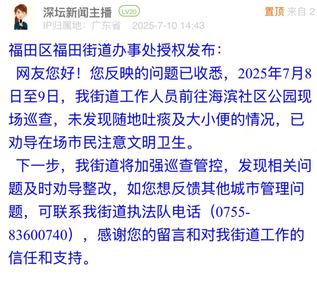 案例點(diǎn)評:對于市民反映的路面油污問題,布吉街道辦立即安排環(huán)衛(wèi)部門進(jìn)行清洗,并于第二日在問政帖文下進(jìn)行回復(fù),以現(xiàn)場圖片展示路面清理效果,表示將加強(qiáng)后續(xù)巡查。此次處置展現(xiàn)了基層部門高效務(wù)實(shí)的問題處理能力,為城市道路環(huán)境管理提供了快速響應(yīng)與長效維護(hù)相結(jié)合的實(shí)踐范例,切實(shí)回應(yīng)了市民對潔凈環(huán)境的期待。