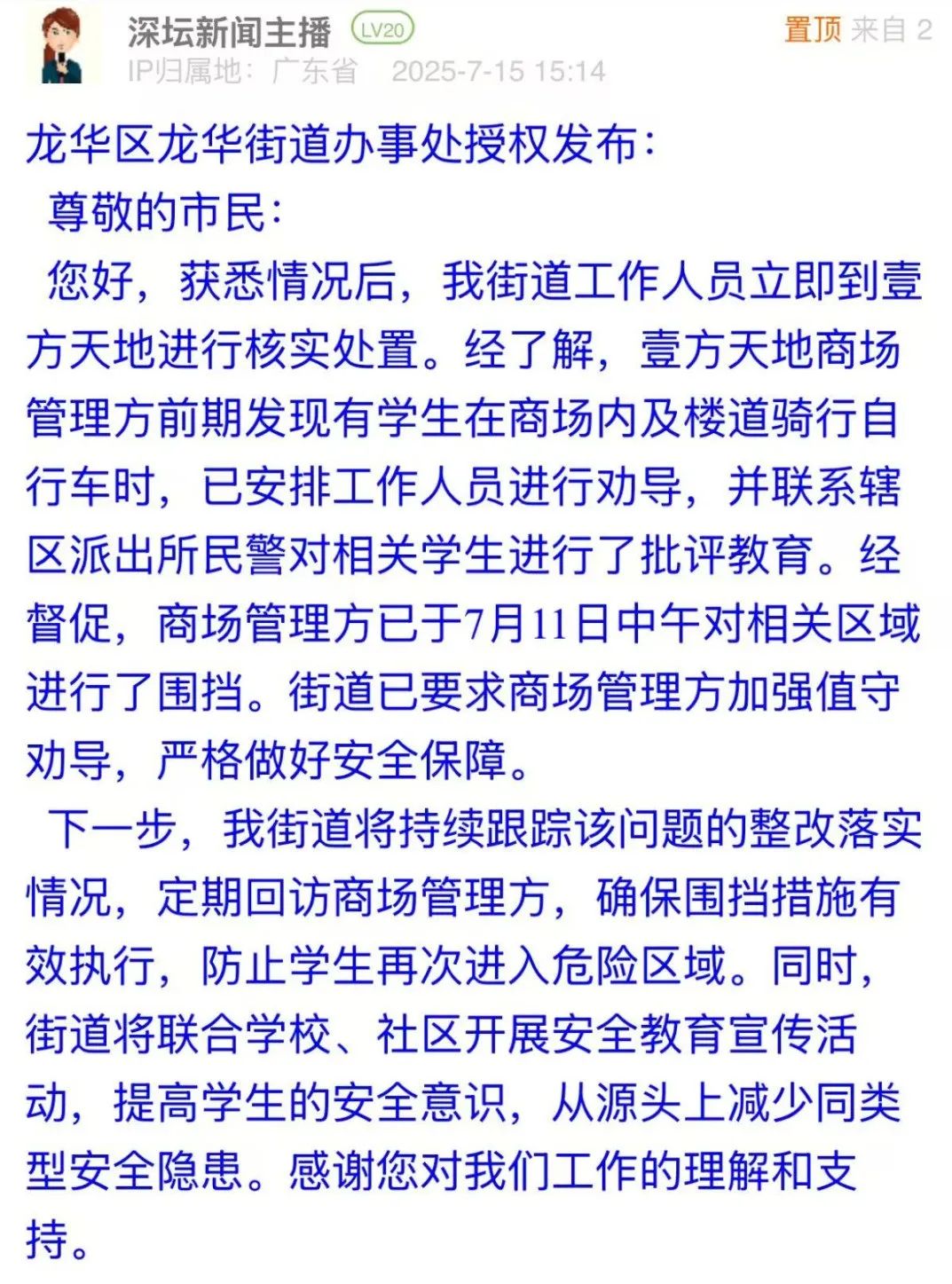 2、有市民反映龍華區(qū)壹方天地內(nèi)有學(xué)生危險(xiǎn)騎行,質(zhì)疑商場安全監(jiān)管不足