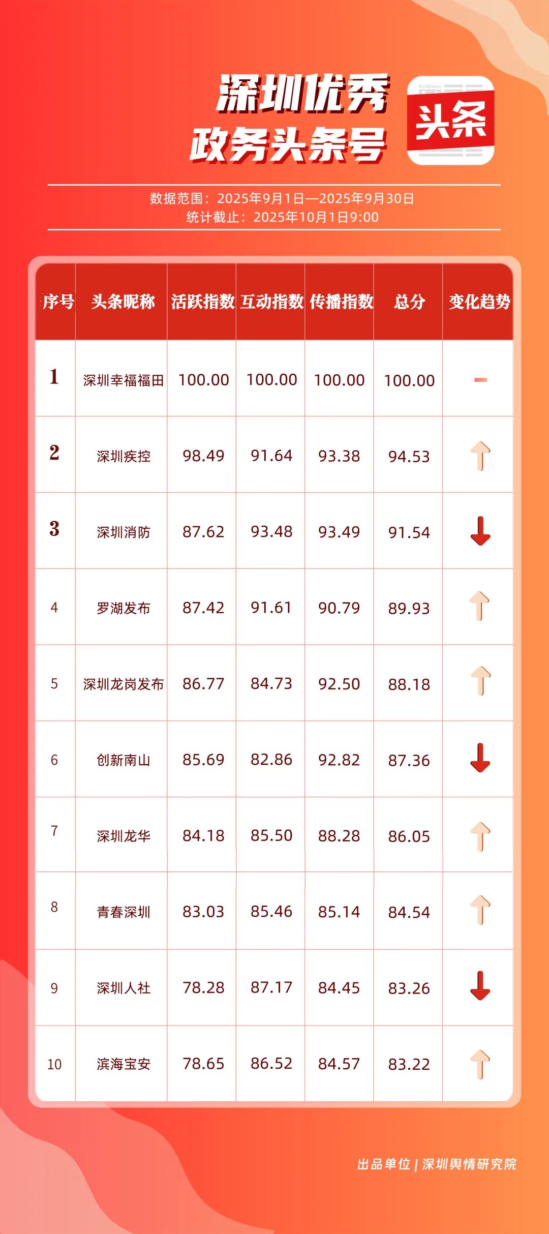 9月,“深圳幸福福田”“深圳疾控”“深圳消防”“羅湖發(fā)布”“深圳龍崗發(fā)布”“創(chuàng)新南山”“深圳龍華”“青春深圳”“深圳人社”“濱海寶安”共10個政務頭條號入選“優(yōu)秀政務頭條號”榜單?!吧钲谛腋8L铩狈€(wěn)居榜單首位,在傳播、互動等方面均表現(xiàn)卓越;“深圳疾控”關(guān)注民生健康,有關(guān)“喝茶的好處”“非正規(guī)醫(yī)美針風險”兩篇文章閱讀均超10萬次,為市民提供健康信息;“深圳消防”聚焦消防安全領(lǐng)域,提醒市民注意安全。相關(guān)上榜賬號表現(xiàn)優(yōu)異,注重內(nèi)容實用化、互動場景化,彰顯了政務新媒體的服務效能。