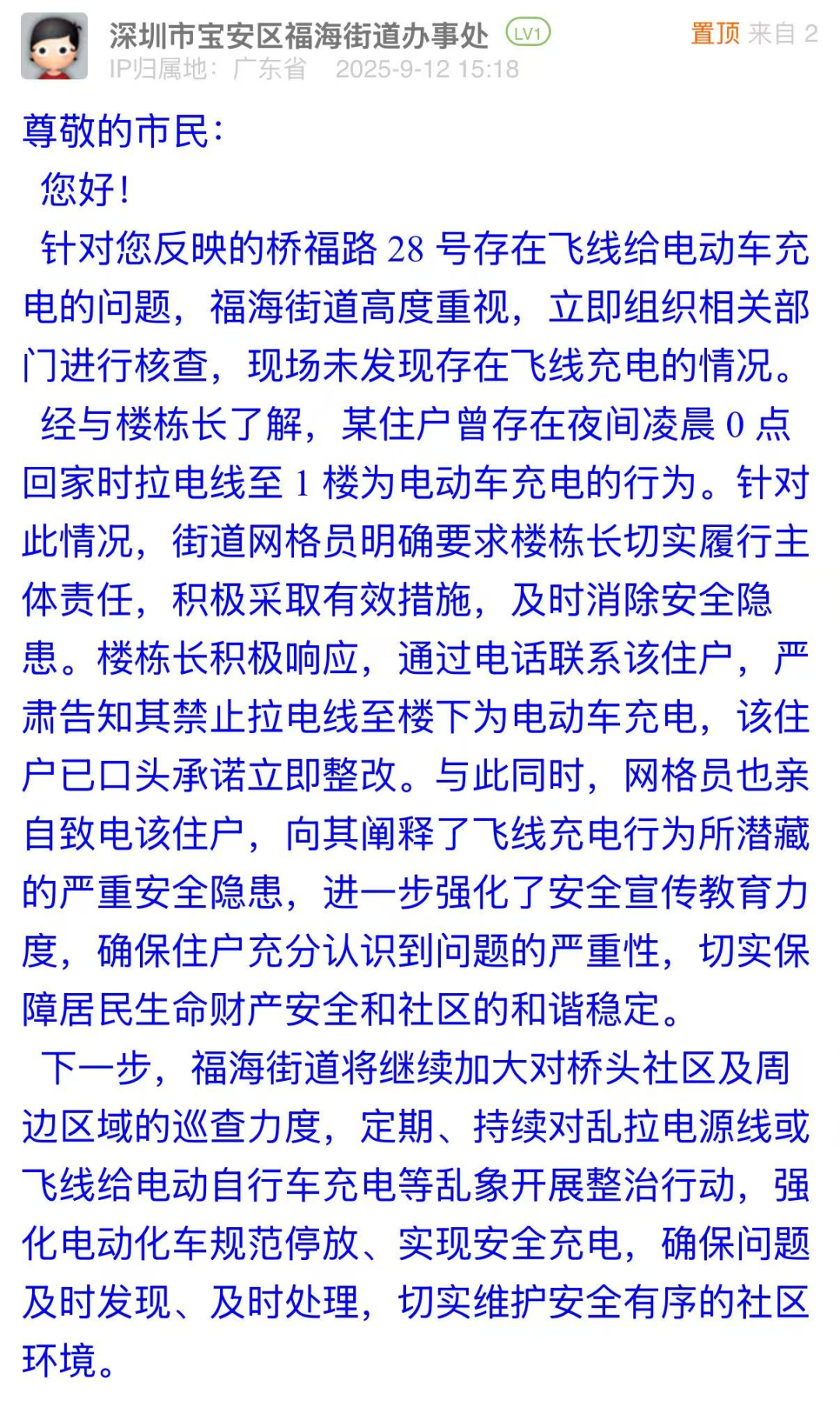 案例點評:福海街道辦對電動車“飛線充電”問題展現(xiàn)出快速響應(yīng)、權(quán)責明晰的治理態(tài)度,第一時間組織核查,既明確主體責任、嚴令整改,又細致開展安全教育,讓住戶充分認知“飛線充電”的嚴重危害,體現(xiàn)執(zhí)法和普法的雙重擔當。回應(yīng)中,街道辦還表示將強化巡查力度、開展整治行動,建立長效治理機制,維護社區(qū)安全秩序,彰顯了基層治理中“問題導(dǎo)向、標本兼治”的治理邏輯。