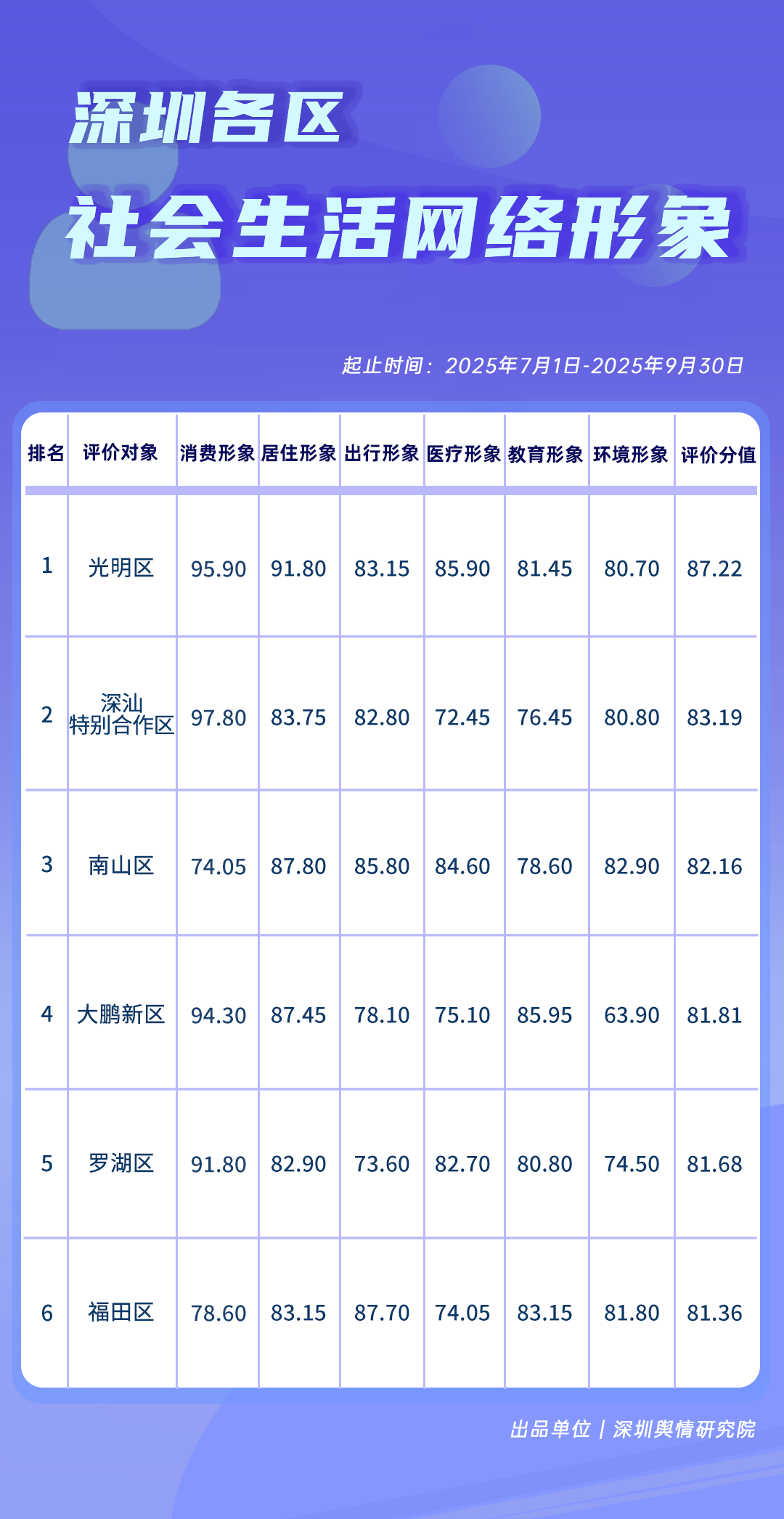 7-9月,《深圳各區(qū)社會生活網(wǎng)絡(luò)形象榜》中,光明區(qū)憑借在消費、居住等方面的良好網(wǎng)絡(luò)呈現(xiàn),獲得較高綜合評價分值,深汕特別合作區(qū)、南山區(qū)也表現(xiàn)優(yōu)異,得分在83分左右。大鵬新區(qū)、羅湖區(qū)、福田區(qū)也在榜單中占據(jù)靠前位置,體現(xiàn)了各區(qū)在社會生活方面的網(wǎng)絡(luò)形象情況,也反映出各區(qū)在提升民生服務(wù)質(zhì)量與促進(jìn)區(qū)域協(xié)調(diào)發(fā)展方面取得的積極成效。
