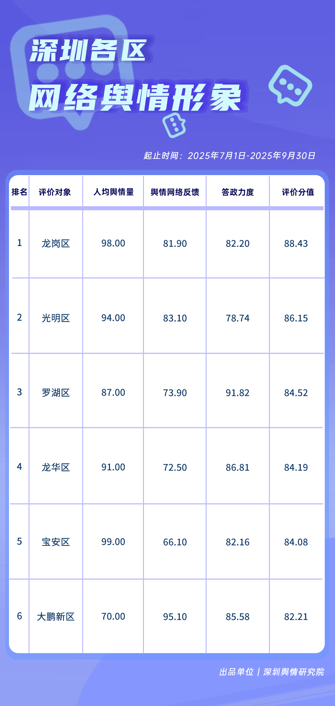 7-9月,在網(wǎng)絡(luò)輿情方面,龍崗區(qū)、光明區(qū)得分在86分以上,位居榜單前二,人均輿情量得分較高。羅湖區(qū)、龍華區(qū)、寶安區(qū)、大鵬新區(qū)在輿情治理方面也各有亮點,充分體現(xiàn)了各區(qū)在維護(hù)清朗網(wǎng)絡(luò)空間、高效回應(yīng)公眾關(guān)切方面的積極作為與責(zé)任擔(dān)當(dāng)。