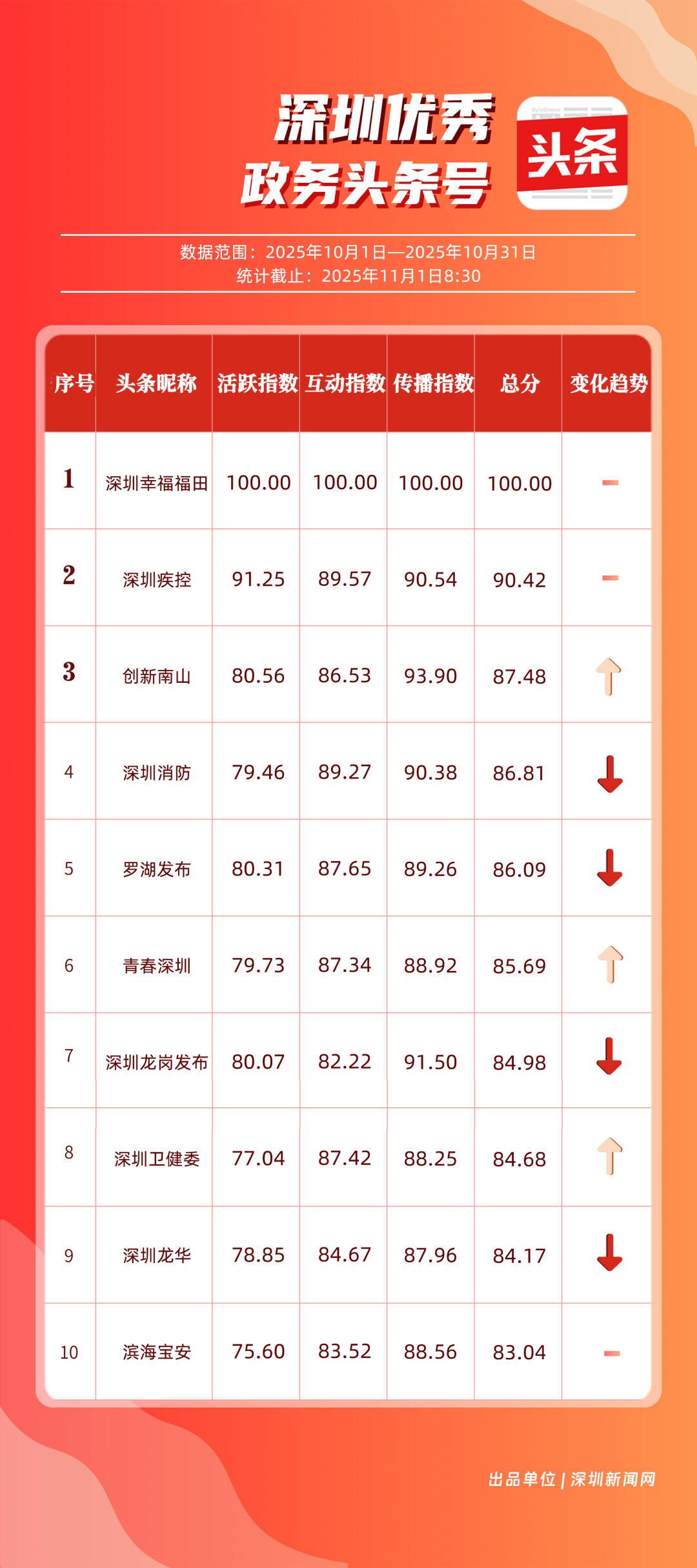10月,“深圳幸福福田”“深圳疾控”“創(chuàng)新南山”“深圳消防”“羅湖發(fā)布”“青春深圳”“深圳龍崗發(fā)布”“深圳衛(wèi)健委”“深圳龍華”“濱海寶安”共10個政務(wù)頭條號入選“優(yōu)秀政務(wù)頭條號”榜單。“深圳幸福福田”在活躍、互動、傳播均收獲較好成果,蟬聯(lián)榜首;“深圳疾控”得分超90分,持續(xù)發(fā)布民生健康類內(nèi)容,為市民健康保駕護航;“創(chuàng)新南山”內(nèi)容創(chuàng)作緊扣民生與區(qū)域特色,位列榜單第三名?!吧钲谙馈薄傲_湖發(fā)布”等賬號也位列榜單前列,成為區(qū)域政務(wù)新媒體內(nèi)容創(chuàng)新、信息傳遞的標(biāo)桿。