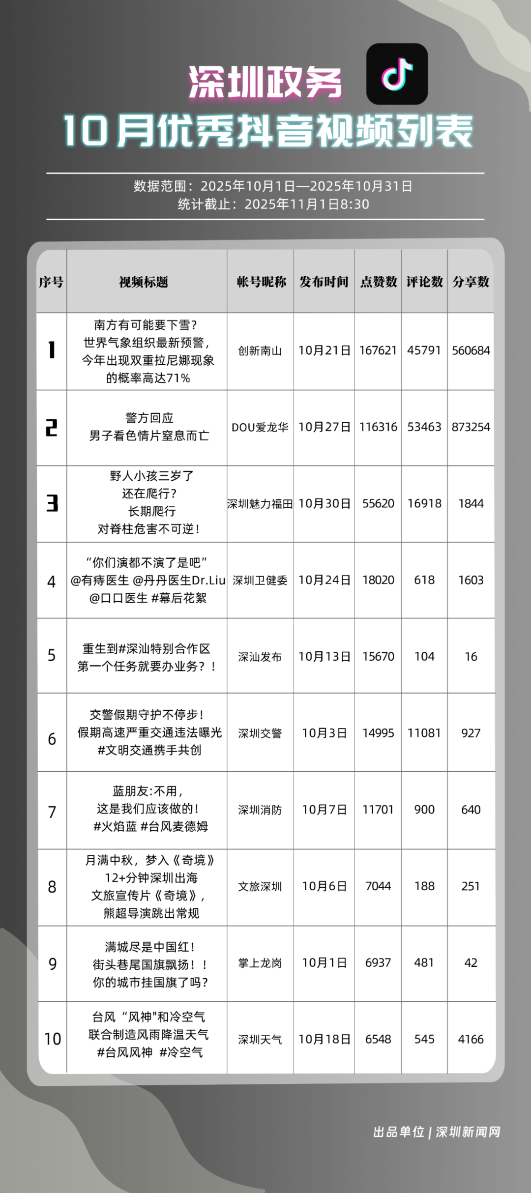 2025年10月期《深圳優(yōu)秀政務(wù)新媒體矩陣》正式發(fā)布,上榜矩陣以深度創(chuàng)新的傳播思路與精細化的服務(wù)持續(xù)領(lǐng)跑,為政務(wù)新媒體行業(yè)貢獻了可復(fù)制的實踐經(jīng)驗,深化政務(wù)信息與公眾喜好的精準對接,為深圳政務(wù)新媒體高質(zhì)量發(fā)展注入新動能與新活力。