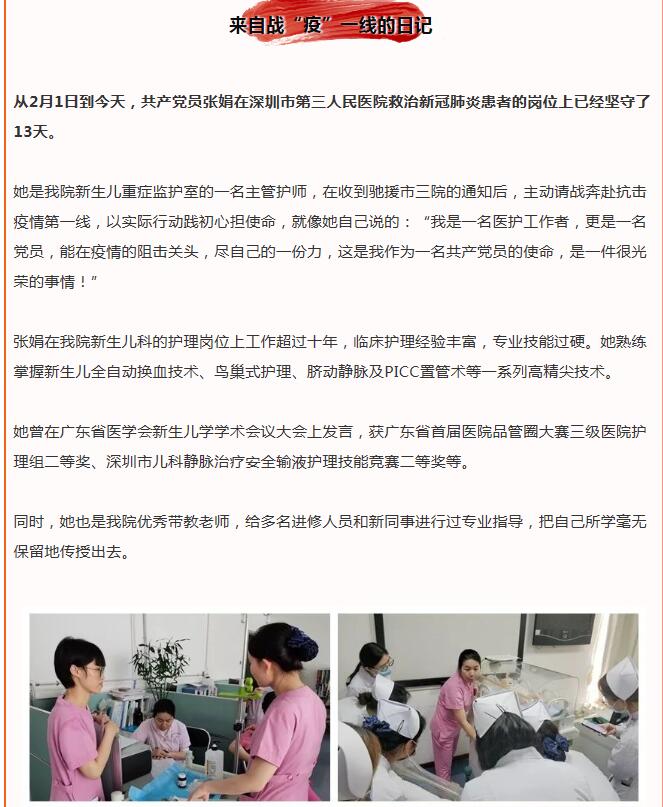 賴碧娟是深圳市婦幼保健院急診黨支部書記、急診科護士長。作為一名老黨員,抱著“疫情快些得到控制,最大程度減少損失”的信念,新冠肺炎疫情期間,她帶頭沖在一線,整個春節(jié)期間基本都在醫(yī)院加班。“我們急診科全體黨員和醫(yī)護人員都嚴陣以待。只要有需要,所有人都沖在一線?!?/p>