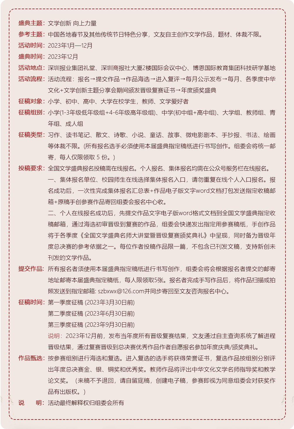 2023年度全國文學(xué)盛典”是面向小學(xué)、初中、高中學(xué)生,以及教師和文學(xué)愛好者而開展的文學(xué)系列活動(dòng),將文學(xué)的魅力持續(xù)傳播。廣大文學(xué)愛好者自愿報(bào)名參加。在本屆活動(dòng)進(jìn)程中,將繼續(xù)為孩子和文學(xué)愛好者們創(chuàng)建其熱愛的中華文化文學(xué)創(chuàng)作的滋養(yǎng)平臺(tái),為文學(xué)愛好者和優(yōu)秀的文學(xué)特長生提供更廣闊的創(chuàng)作實(shí)踐平臺(tái)。教育界學(xué)術(shù)研究領(lǐng)域?qū)<医淌?、作家、詩人、文學(xué)評(píng)論家等組成的專家評(píng)審委員會(huì)本著公開、公平、公正的原則,對(duì)參評(píng)作品進(jìn)行審評(píng)。 組委會(huì)在廣大師生文友的支持與建議下,“2023年度全國文學(xué)盛典”將持續(xù)開展系列文創(chuàng)主題活動(dòng):“全國文學(xué)盛典之走進(jìn)名師”“全國青少年冰心文學(xué)盛典2023”、教育部創(chuàng)刊中國校園文學(xué)《一起向未來·中國校園文學(xué)》主題征投稿、“校園專場(chǎng)”“專家分享會(huì)”“文學(xué)創(chuàng)新 向上力量——專家進(jìn)校園”“全國文學(xué)盛典·各季品質(zhì)典禮”“優(yōu)秀作品校園巡展”等等。為參賽選手提供廣泛的交流、學(xué)習(xí)、鍛煉機(jī)會(huì)和展示平臺(tái)。>>>